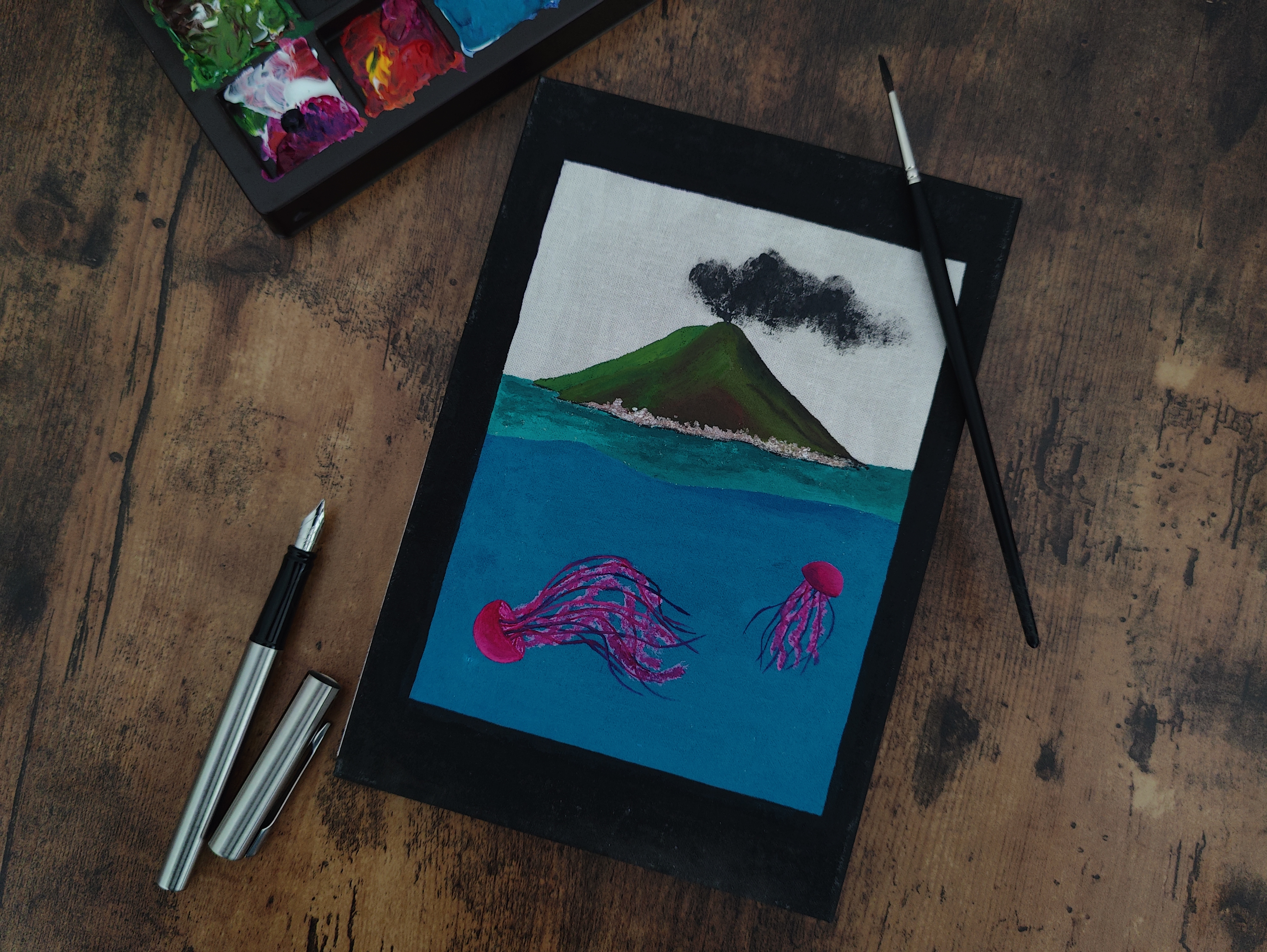 Plus nous nous éloignons du village, plus le paysage se dégage et se durcit. Les maisons blanches se tassent derrière nous. Au loin, la mer prend toute la place. Le vent forcit, soulevant des grains de sable qui viennent picoter mes mollets. Là où passent les marcheurs, le sable gris noircit. Pensant sentir de l’humidité, je me baisse et en saisis une pincée. Il n’est pas humide, il est chaud… Très chaud ! Comme si la chaleur réveillait sa couleur. Lentement, le volcan commence à parler.